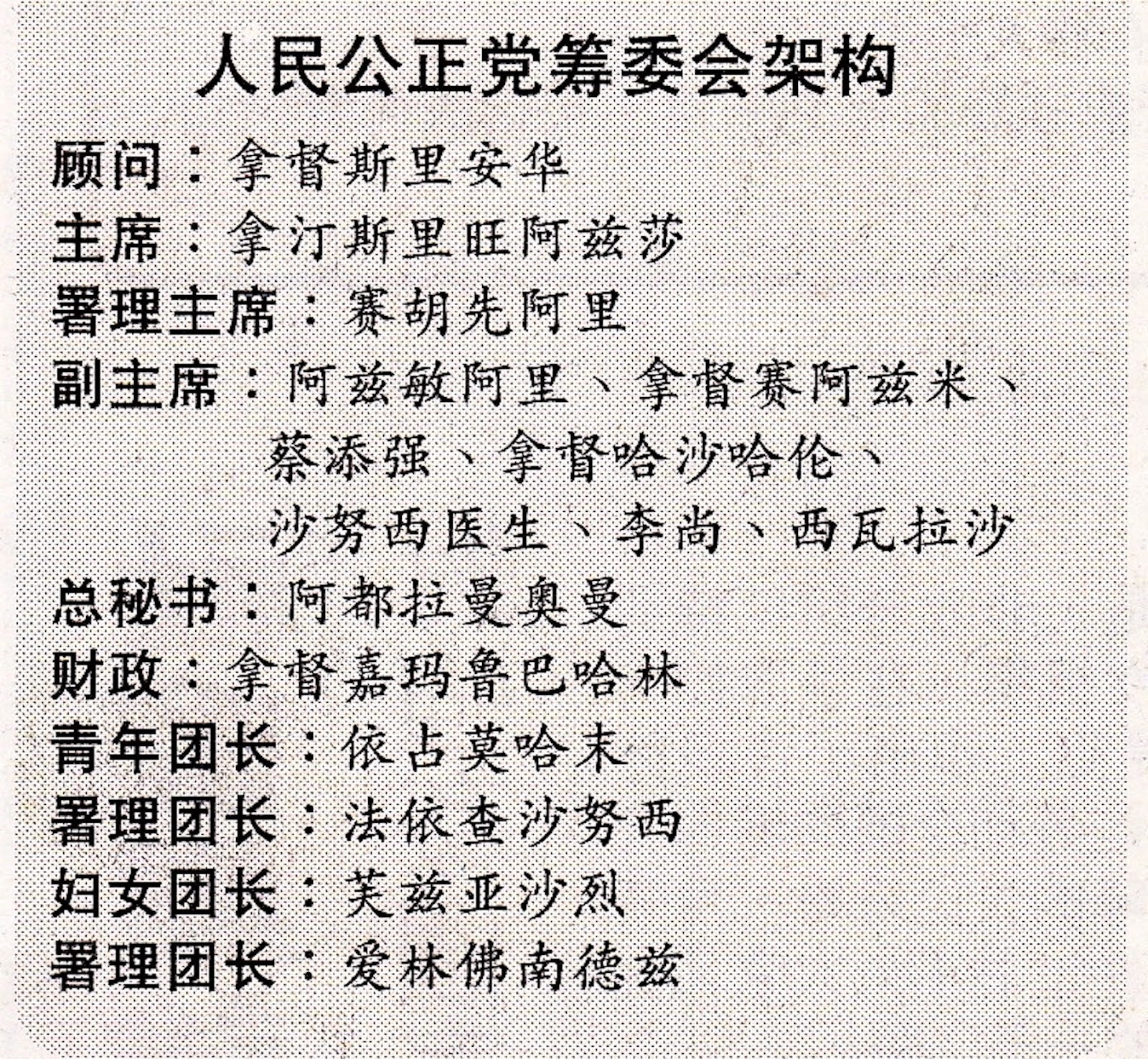 人民公正党成立初期,为了宣扬公正党的政策,表达公正党对各种时事的立场,原则及观点,笔者与立安同志毅然负起党的文宣工作重担,期间,也负责中文党报《新政治》的出版工作。